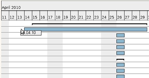 Anfang und Ende eines Vorgangs kann man durch "Ziehen" des Gantt-Balkens mit der Maus festlegen. Achten Sie dabei darauf, dass während dieses Vorgangs ein Doppelpfeil erscheint.