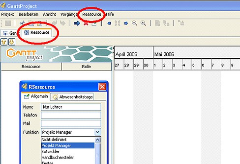 Wechseln Sie dazu in die Ansicht Ressource (im Register neben Gantt ). Über das Kontextmenü (Rechtsklick) lässt sich nun wieder bequem der Eintrag für eine ' Neue Ressource ' vornehmen: Name , E-Mail, Telefon und Funktion .