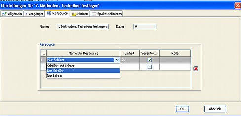 Wählen Sie Vorgang: Eigenschaften , Register Ressource . Durch Klick in das Feld Name der Ressource werden die bereits vorhandenen Ressourcen aufgelistet. Per Klick lassen sich nun eine oder mehrere markierte Einträge übernehmen.