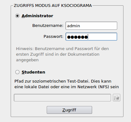 Starten Sie ksociograma. Melden Sie sich als Programmadministrator mit den folgenden Benutzerdaten an ksociograma an: