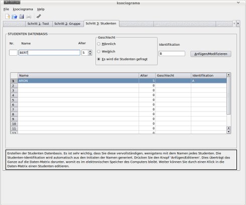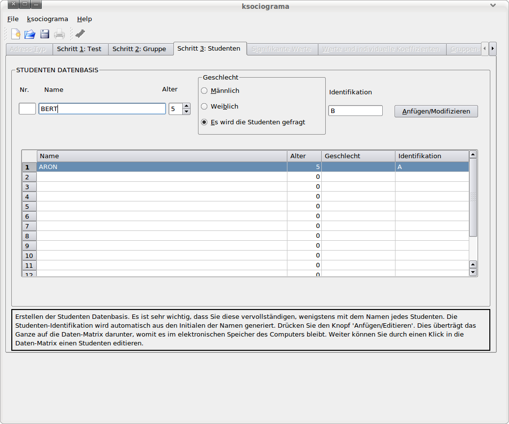 Da ksociograma in der Auswertung keine vollständigen Namen anzeigt, müssen Sie beim Eintragen der Namen Ihrer Probanden kreativ werden und evtl. Vor- und Nachname vertauschen oder gelegentlich auch einen Nachnamen erfinden, damit die vom Programm vergebene Identifikation eindeutig bleibt. Oder Sie führen eine Liste, in der die Namen Ihrer Schülerinnen und Schüler pseudonymisiert vorlliegen - also Albert Anderson (AA); Berta Brecht (BB); Clara Chodorowski (CC) etc. pp. Nur der Durchführende kennt dann die Klarnamen zu den Pseudonymen.