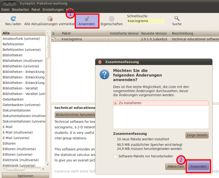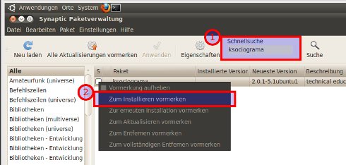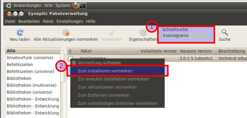 Geben Sie das Feld "Schnellsuche" in der Synaptic-Paketverwaltung ksociograma ein und markieren Sie dieses durch Anklicken zur Installation ("Zum Installieren vormerken"); -