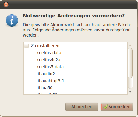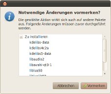 Ubuntu gibt nun an, welche weiteren Pakete es installieren muss, damit ksociograma ohne Probleme läuft. Klicken Sie in diesem Fensterchen auf "Vormerken"; -