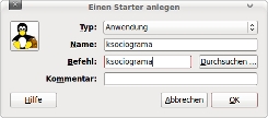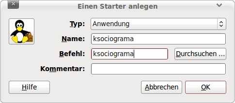 Tragen Sie einen "Namen" Ihrer Wahl ein. Als "Befehl" müssen Sie ksociograma eingeben. Ubuntu findet dann automatisch das passende Icon. Tragen Sie noch einen "Kommentar" Ihrer Wahl ein und klicken Sie dann auf "OK". -