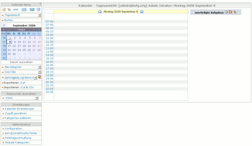 Termine werden nicht nur in die Oberfläche eingetragen, sondern können über iCal oder CalDAV exportiert und auch importiert werden. Ein Export über CSV funktioniert selbstverständlich ebenfalls.