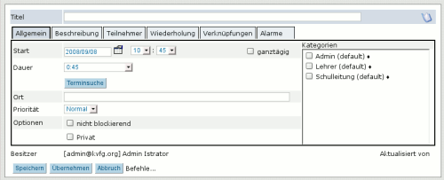 Auf mehrere Registerkarten verteilt finden Sie hier Funktionen für die Einladung ganzer Benutzergruppen oder auch einzelner Personen zu einem Terminvorschlag. Prioritäten lassen sich ebenso festlegen wie Verknüpfungen mit beliebigen anderen Modulen in eGW, Erinnerungen (als E-Mail) und Wiederholungen oder Serien.