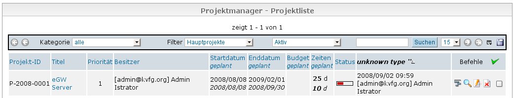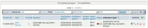 In einer Projektliste wird eine Übersicht über die laufenden (und auch abgeschlossenen sowie zukünftigen - je nach Einstellung) Projekte angezeigt. Titel sowie Hauptverantwortlicher ("Besitzer"), Start- und Enddatum, Budget und Status (wie viel Prozent erledigt) lassen sich schon hier ablesen.
