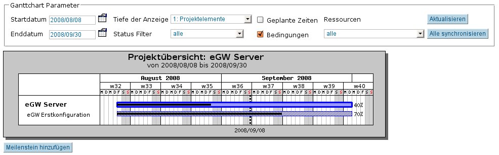 Die Übersichtlichkeit nimmt allerdings selbst gegenüber einer ebenfalls möglichen Detailansicht als Liste weiter zu, wenn komplexere Projekte, die mit vielen voneinander abhängigen Aufgaben verknüpft sind, als GANTT Chart angezeigt werden kann. eGW bringt ein solches Modul schon mit.