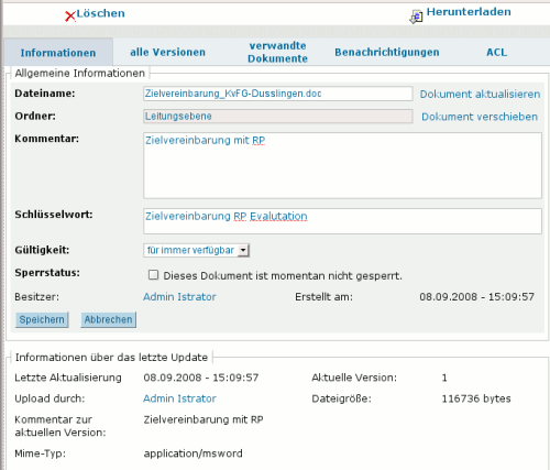 Nach einem Klick auf einen Eintrag in myDMS wird ein Fenster geöffnet, das die Verwaltung oder den Download des Dokumentes erlaubt. Über die Registerkarte [ACL] für Access Control List lassen sich bestimmte Benutzergruppen einrichten, die dieses Dokument einsehen dürfen - oder eben nicht.