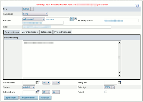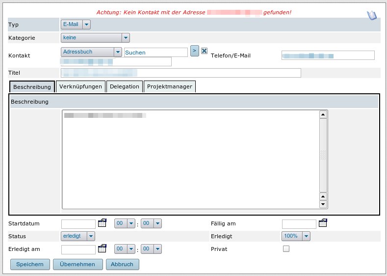 Im Infolog - das Fenster öffnet sich beim Aktivieren der Option in FeLaMiMails automatisch und übernimmt den Text der Nachricht - können dann weitere Erreignisse und Module von eGW mit dieser E-Mail verknüpft werden. Auch die Delegation des Prozesses an einen anderen Benutzer ist möglich so wie die Zuordnung der E-Mail zu einem bestimmten Projekt.