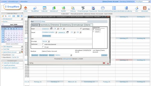 Projekte wie eGroupWare (eGW) - im Bild oben eine Kalenderansicht - erlauben es, Geschäftsprozesse abzubilden und online zusammen Termine sowie Ressourcen (Kontakte, Materialien, Räume, Links, Dokumente etc.) zu verwalten. Weiter bringen derartige System auch kleinere DMS mit.