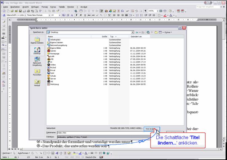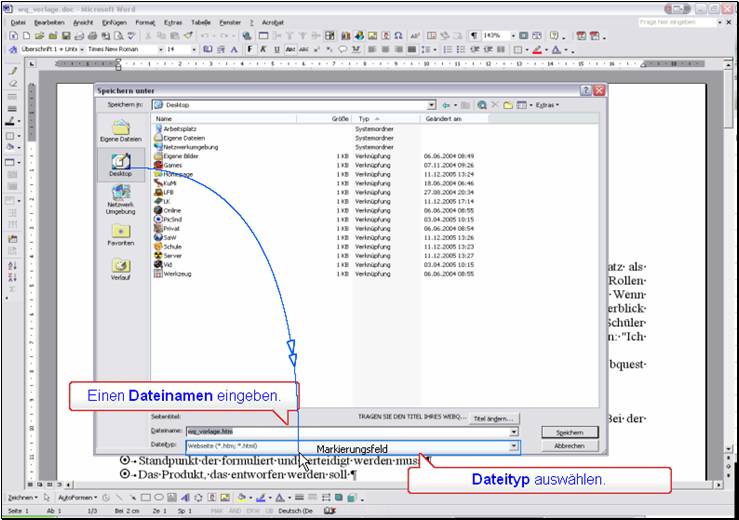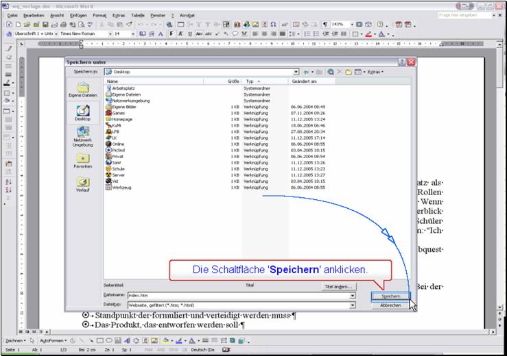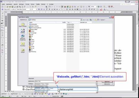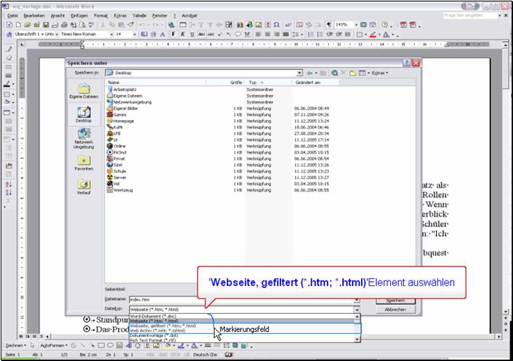 Als [Dateityp] ist [Webseite (*.htm; *.html)] voreingestellt. Ändern Sie dies auf [Webseite gefiltert (*.htm; *.html)] um unnötige und platzverbrauchende Angaben im Dokument zu entfernen.