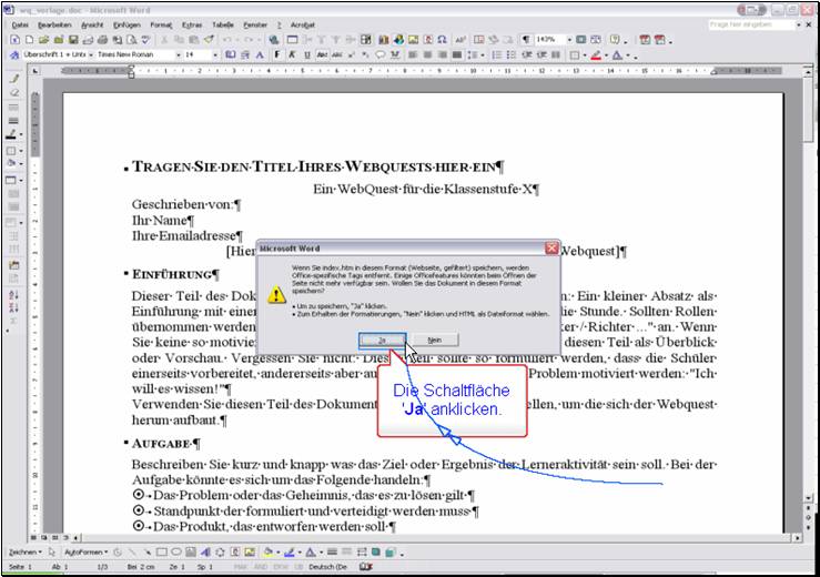 Word merkt dann an, dass Sie beim Speichern im Format "gefilterte Webseite" Formatierungsmerkmale verlieren werden. Genau das wollen Sie aber, da nur so das Word HTML relativ schlank wird. Klicken Sie also auf [Ja].
