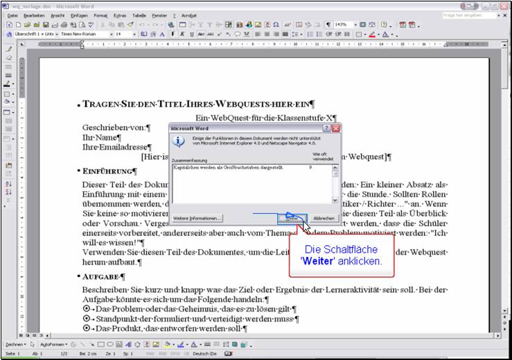 Word meldet Ihnen zurück, welche Formatierungsmerkmale durch das Speichern als gefilterte Webseite verloren gehen. Klicken Sie hier einfach auf den Schalter [Weiter].