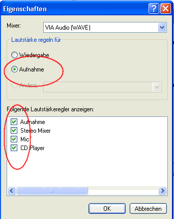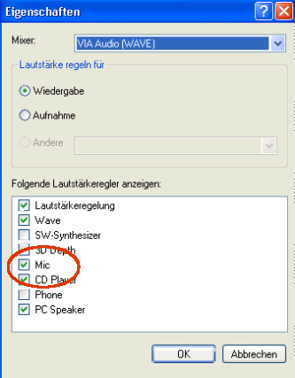 Sollte kein Feld MIKROFON zu finden sein, kann man es bei OPTIONEN, EIGENSCHAFTEN und FOLGENDE LAUTSTÄRKEREGLER ANZEIGEN anklicken.
