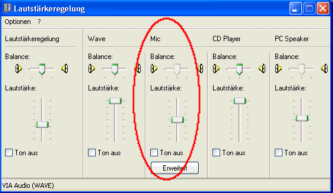 Über START, PROGRAMME, ZUBEHÖR, UNTERHALTUNGSMEDIEN gelangt man zur LAUTSTÄRKEREGELUNG. In diesem Fenster überprüft man zunächst, ob das Häkchen bei TON AUS in der Spalte MIKROFON entfernt ist.