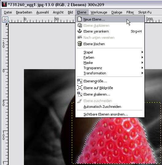 Der Ausschnitt aus der Erdbeere wird nun in das zweite Bild (Ei) eingefügt. Wechseln Sie hierzu in der Taskleiste in das zweite Bild und vergrößern Sie dieses so, dass es zwischen die beiden GIMP Fenster passt.