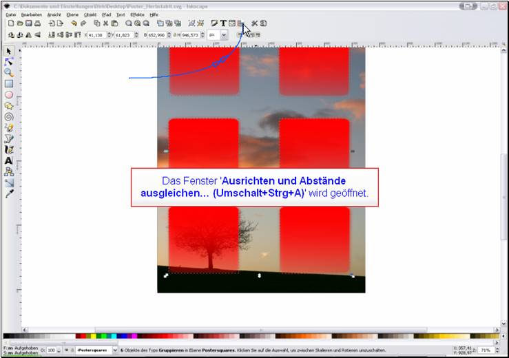 Markieren Sie alle Objekte, die Sie ausrichten wollen. Wählen Sie dann in der Symbolleiste die Option [Ausrichten und Abstände ausgleichen] oder drücken Sie [Umschalten] [Strg] [A] auf der Tastatur.