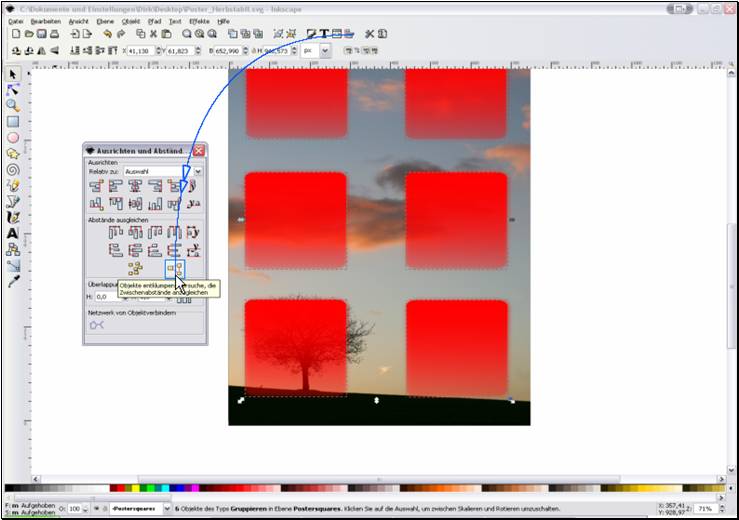 Um mehrere Objekte gleichmäßig auf dem Arbeitsbereich zu verteilen und gleichzeitig auch für die richtigen Abstände zu sorgen wählen Sie die Option [Entklumpen].