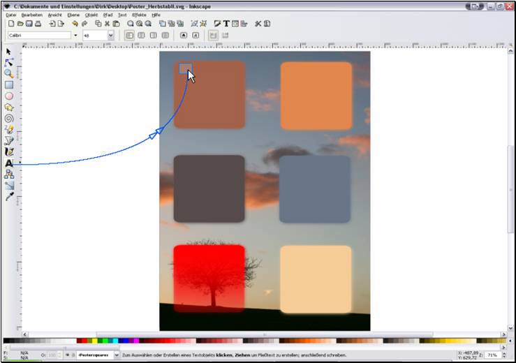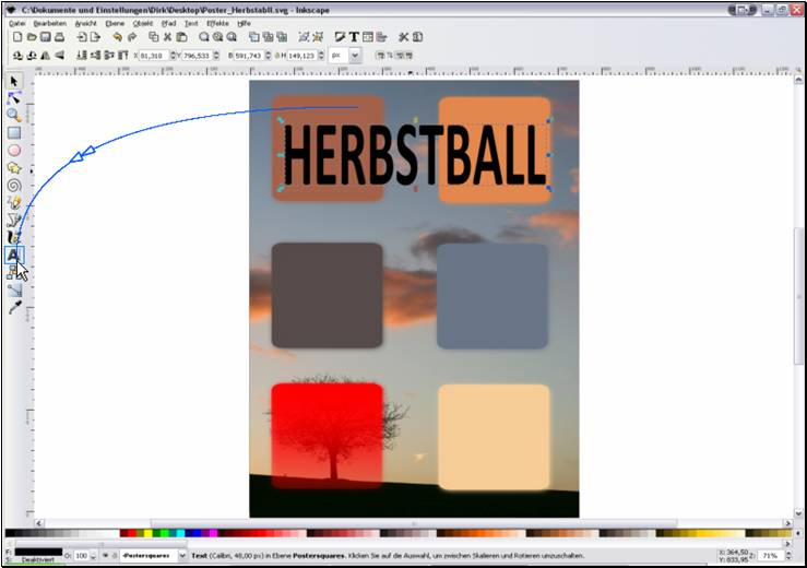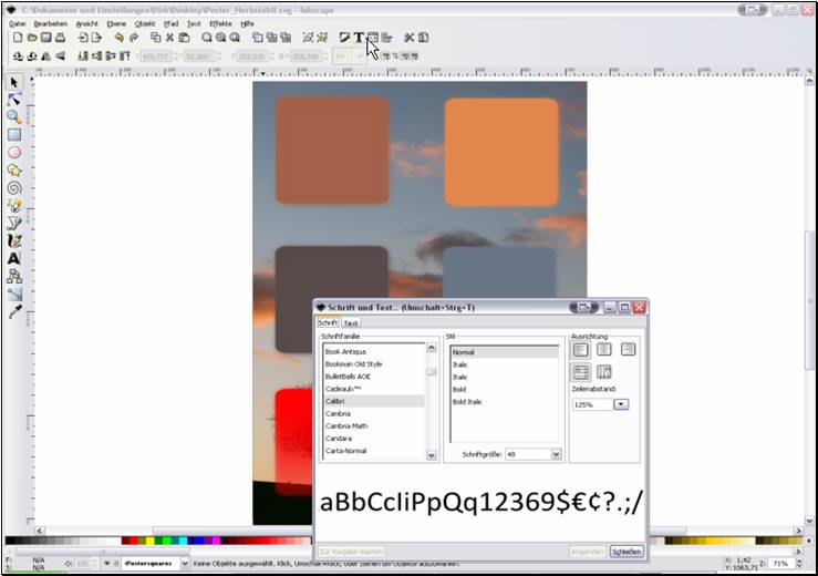 Textobjekte können wie jedes andere Objekt auch mit Farben versehen und beliebig skaliert werden. Für weitere Textobjekte wählen Sie wieder das Textwerkzeug in der Seitenleiste aus und klicken Sie danach an die jeweils gewünschte Position für den Text im Arbeitsbereich.