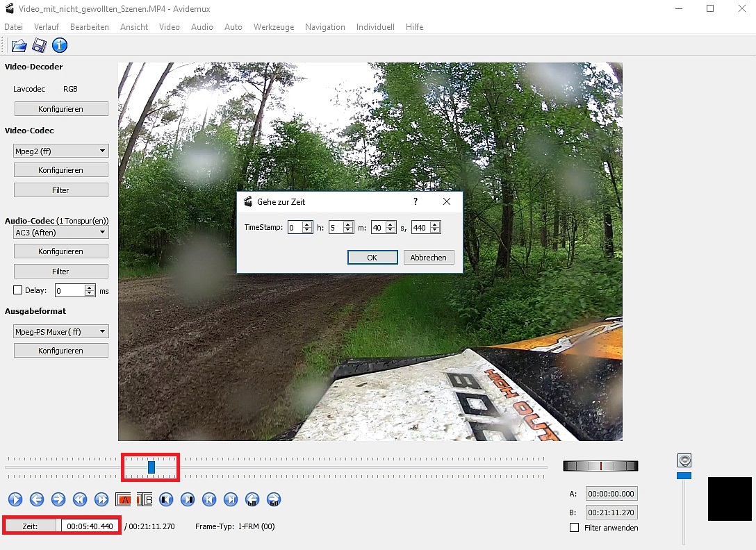Zunächst steuert man in der Oberfläche den gewünschten Zeitpunkt des Videos an, ab dem der Videoschnitt vorgenommen werden soll. Dies kann mittels exaktem Timecode bzw. über Springen auf der Zeitleiste vorgenommen werden.