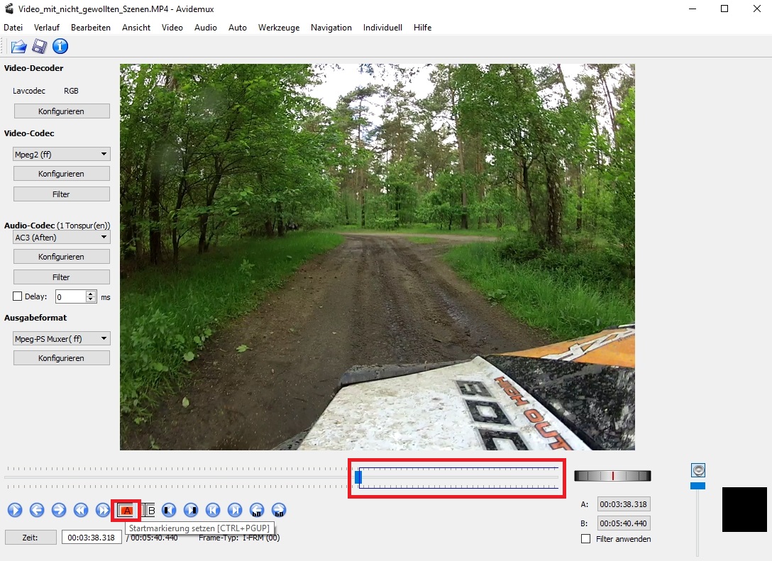 Nun setzt man die Startmarkierung, ab wann das Video abgeschnitten werden soll.