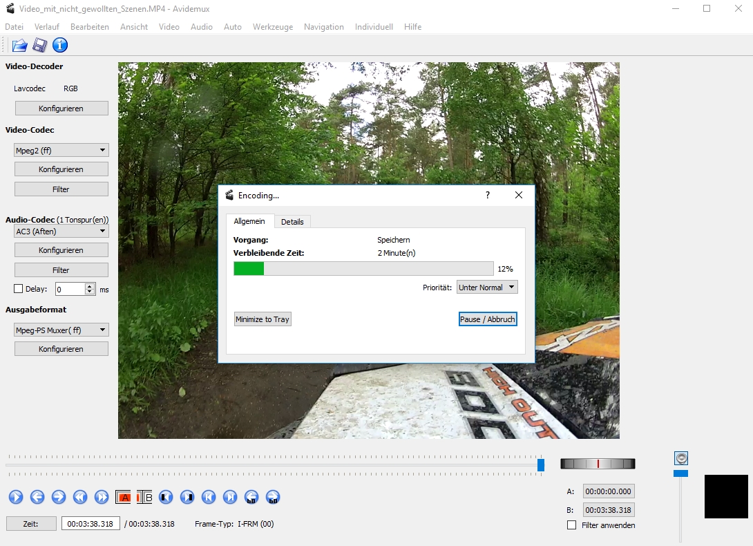Der letzte Schritt ist, dass Video noch zu speichern und zu encoden. Das heißt, Avidemux wandelt das Video mit den gewählten Einstellungen um und es kann im Anschluss an dem gewünschten Ort gespeichert werden.