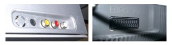 Links sehen Sie die sogenannten Cinch Eingänge. Dabei ist der gelbe Eingang das Bildsignal und rot/weiß die beiden Audiosignal Eingänge, also die Anschlüsse für den Ton. Rechts davon ist eine oben erwähnte Scart Buchse abgebildet. Es gib übrigens für jede Kombination der Eingänge und Ausgänge passende Adapterkabel auf dem Markt.