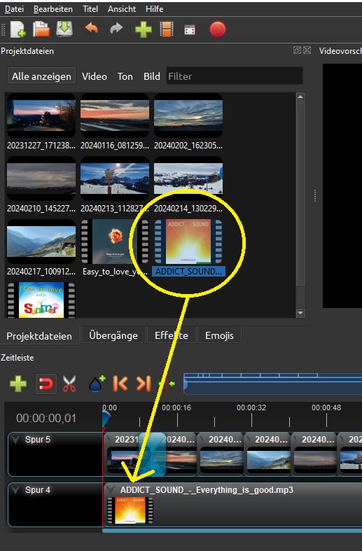 Um die Bilder oder Videos mit Musik zu unterlegen, gehen Sie wieder auf das grüne Plus und fügen Musik in das linke Feld ein. Das ausgewählte Stück ziehen Sie, wie zuvor die Bild-/ Videodateien, in die Spur unter den Bildern. Auch hier können Sie, wie bei den Bildern / Videos Übergänge gestalten, wenn Sie mehrere Musikstücke hintereinander anordnen.