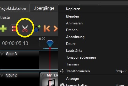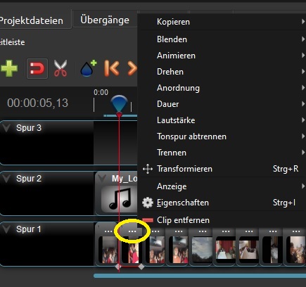 Sobald eine neue Datei eingefügt wird, rutscht diese automatisch ans Ende der vorherigen, auch wenn sie in eine andere Spur gebracht wird. Die einzelnen Dateien können mit einem Rechtsklick auf die drei Punkte oberhalb des Bildes bearbeitet werden. In dem sich öffnenden Fenster findet man alle Möglichkeiten der Bearbeitung.