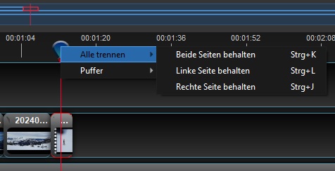 Eine andere Möglichkeit ist es, mit dem Schieber an die Stelle im Video zu gehen, an der es geschnitten werden soll. Mit dem rechten Mausklick öffnet sich ein neues Fenster. Über die Navigation „Alle trennen“ kann man auswählen, wo das Video geschnitten werden soll und welche Seite man behält.