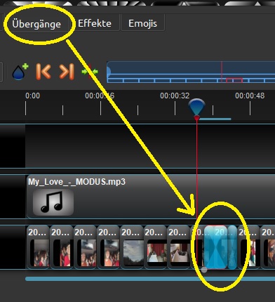 Die Dauer wird über die blaue Maske eingestellt. Diese lässt sich rechts und links verschieben, wenn man mit der Maus an den Rand klickt. Der Übergang kann so verlängert oder verkürzt werden. Möchte man einen anderen Übergang wählen, muss man den zuerst gewählten löschen und kann dann einen anderen auswählen.