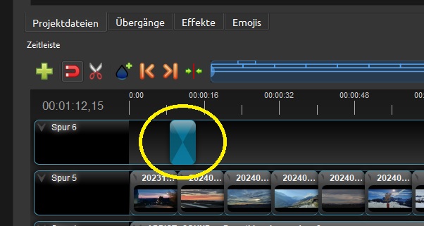Zwischen Videos und Fotos kann man einen Übergang einfügen, damit der Film am Ende fließend wirkt. Übergänge fügt man über den Reiter „Übergänge“ ein. Es öffnet sich im Editor ein Fenster mit den verschiedenen Optionen. Nach dem Anklicken und Festhalten kann man den Übergang über die gewünschten Dateien in eine eigene Spur legen. Wenn sie die gewünschte Länge haben, zieht man sie in die Spur der Bilder- und Videodateien.