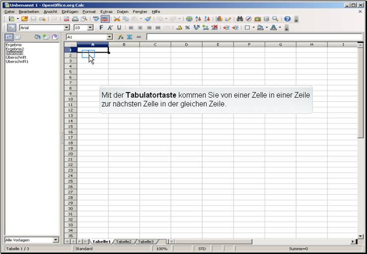 Mit der Tabulatortaste kommen Sie von einer Zelle in einer Zeile zur nächsten Zelle in der gleichen Zeile.