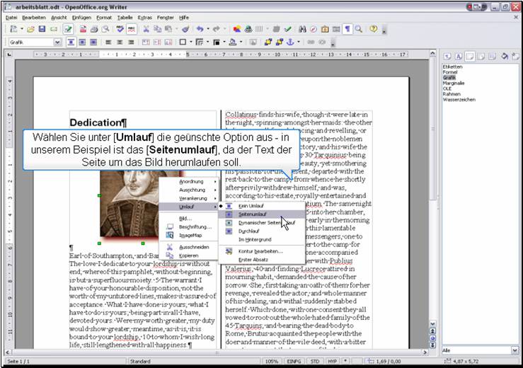 Wählen Sie unter [ Umlauf ] die gewünschte Option aus - in unserem Beispiel ist das [ Seitenumlauf ], da der Text der Seite um das Bild herumlaufen soll.