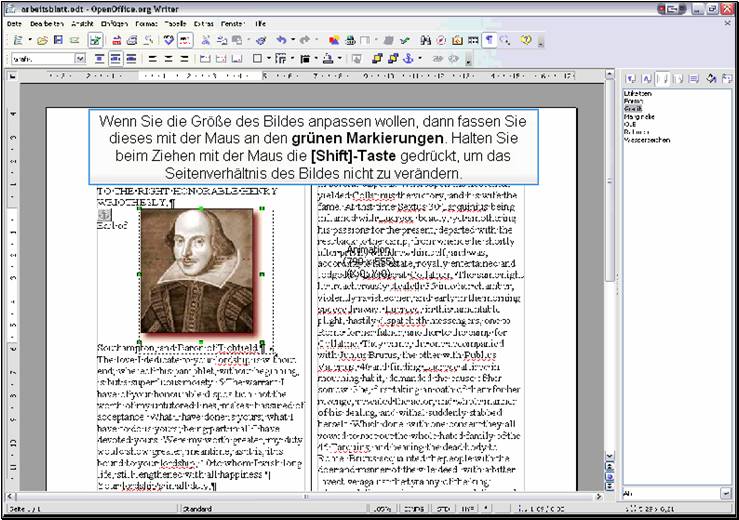 Wenn Sie die Größe des Bildes anpassen wollen, dann fassen Sie dieses mit der Maus an den grünen Markierungen . Halten Sie beim Ziehen mit der Maus die [Shift]-Taste gedrückt, um das Seitenverhältnis des Bildes nicht zu verändern.