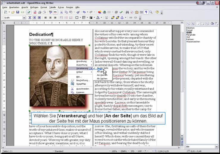 Wählen Sie [ Verankerung ] und hier [ An der Seite ] um das Bild auf der Seite frei mit der Maus positionieren zu können und verschieben Sie dieses mit der Maus an die gewünschte Stelle.