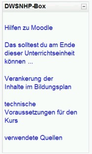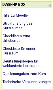 Es handelt sich bei den hier "DWSNHP-Box" genannten Hilfekästen um einen HTML Block, in den Sie "von Hand" Links einfügen. Dieser kann die folgenden Funktionen zur Verfügung stellen: