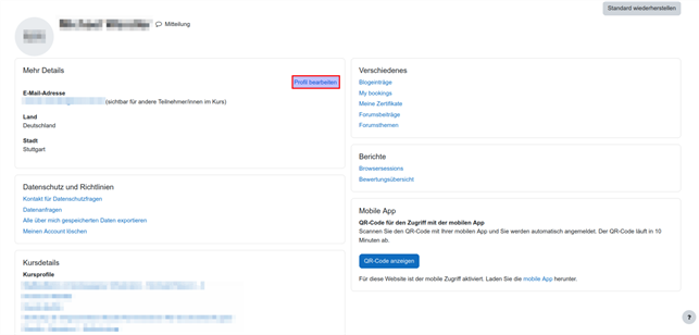 Über diesen Link gelangen Sie zu einer Übersichtsseite mit Ihrem Benutzerprofil. Durch einen Klick auf Profil bearbeiten können Sie hier verschiedene Einstellungen Ihres Profils ändern.