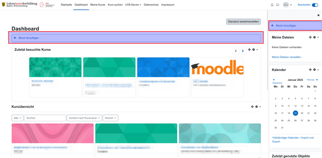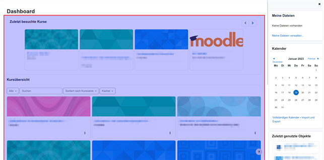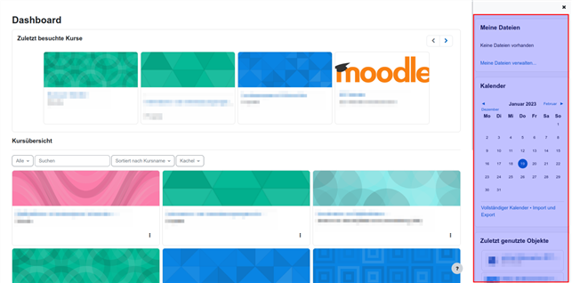Im zentralen Bereich des Dashboards sehen Sie in diesem Beispiel zwei große Blöcke, welche die Moodle-Kurse anzeigen, in die Sie eingeschrieben sind. Im oberen Block werden hier Zuletzt besuchte Kurse angezeigt. Darunter sehen Sie den Block Kursübersicht.
