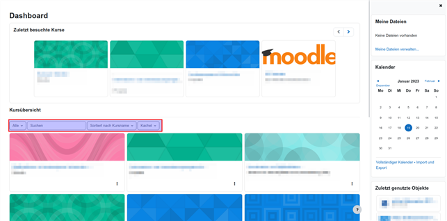 Die Kursübersicht können Sie über verschiedene Filter im oberen Bereich des Blockes anpassen. Mit dem linken Filter können Sie bestimmen, welche Kurse angezeigt werden. Sie haben die Auswahl zwischen Alle (außer aus Ansicht entfernte), Laufende, Künftige, Vergangene, Favoriten, Aus Ansicht entfernte. Über die beiden Filter rechts können Sie die Sortierung und die Darstellung der Anzeige anpassen. Bei jedem Kurs gibt es einen Button mit drei Punkten. Über diesen Button können Sie einen Kurs als Favorit markieren oder einen Kurs aus der Ansicht entfernen. Sie können sich aus der Ansicht entfernte Kurse über den linken Filter anzeigen lassen und haben dann die Möglichkeit, bei dem Button mit den drei Punkten Kurs in Ansicht anzeigen auszuwählen. Dadurch können Sie die Übersichtlichkeit der Kursübersicht anpassen.