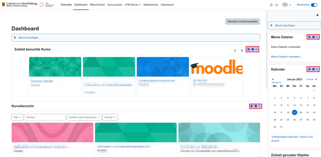 Das Dashboard in Moodle stellt in gewisser Weise Ihren persönlichen Schreibtisch dar. Die Ansicht ist in mehrere Blöcke unterteilt, die Ihre Administratorin bzw. Ihr Administrator anordnet und kann zusätzlich von Ihnen selbst an Ihre Bedürfnisse angepasst werden.