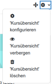Das Kreuz dient der Bestimmung der Position des jeweiligen Blockes. Wenn Sie darauf klicken, erscheint eine Auswahl und Sie können wählen, wo der Block eingefügt werden soll. Alternativ können Sie einfach auf das Kreuz klicken und den Block per Drag & Drop an die gewünschte Stelle im Dashboard ziehen. Über das Zahnrad öffnen Sie ein Menü mit drei Auswahlmöglichkeiten, welche nachfolgend am Beispiel des Blockes Kursübersicht veranschaulicht werden.