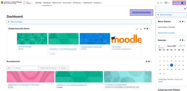 Um die Bearbeitung abzuschließen, deaktivieren Sie oben rechts den Schieberegler Bearbeiten. Über dem Dashboard findet sich zudem der Button Standard wiederherstellen, mit welchem Sie alle Änderungen, die jemals gemacht wurden, zurücksetzen können. Das Dashboard erscheint dann wieder mit den Voreinstellungen Ihres Administrators bzw. Ihrer Administratorin.