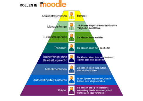 Für das Funktionieren von Moodle sind die Rollen und die damit verbundenen Rechte ein zentraler Bestandteil. Die Rolle von Nutzer:innen hängt davon ab, in welchem Teilbereich oder auch Kontext von Moodle sie sich gerade befinden. Standardmäßig hat man nach der Anmeldung an Moodle die Rolle Authentifizierte/r Nutzer/in. Einen kleinen Überblick welche Rollen es in einem Moodlesystem gibt bietet die Übersicht.