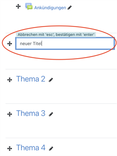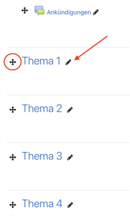 Wenn der Bearbeitungsmodus eingeschaltet ist, ist vor allen Themen das Symbol mit den vier Richtungspfeilen zu sehen und dahinter der Stift. Sobald der Stift z.B. neben Thema 1 angezeigt wird, diesen anklicken und gewünschten Text eintragen. Mit der Enter-Taste bestätigen, um den neuen Text zu übernehmen.
