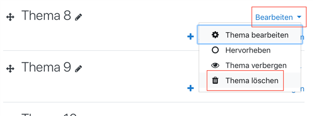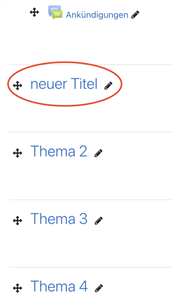 Die einzelnen Themenabschnitte eines Moodlekurses können umbenannt, an eine andere Stelle geschoben und natürlich auch gelöscht werden. Es können auch weitere Themenabschnitte hinzugefügt werden.
