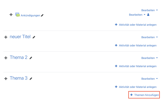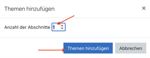 Unterhalb des letzten Themas rechts auf die Schaltfläche + Themen hinzufügen klicken und im folgenden Fenster die gewünschte Anzahl neuer Themenabschitte angeben. Abschließend auf Themen hinzufügen klicken.