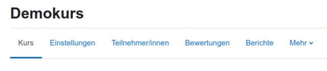 Seit Moodle 4 ist die komplette Kursadministration für Trainer:innen in eine Menuleiste unter dem Kurstitel gewandert. Sie wird Kursnavigation oder auch Kursnavigationsleiste genannt. In den verschiedenen Menupunkten befinden sich alle Optionen zur Verwaltung des Kurses.