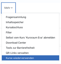 Navigieren Sie als Trainer/in in Ihrem Kurs rechts oben im Menüband zum Punkt Mehr und wählen Sie Kurse wiederverwenden aus.